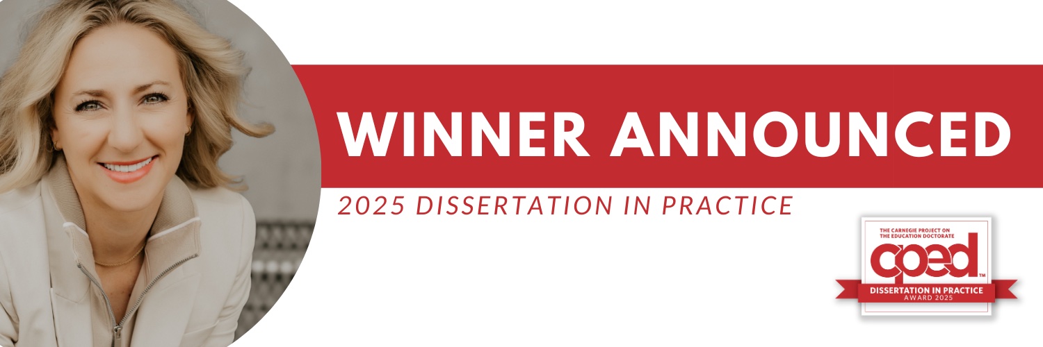 Dissertation in Practice of the Year AwardGeneral Overview of Submission ProcessThis prestigious award is given to EdD graduate(s) whose DiP shows evidence of scholarly endeavors in impacting a complex problem of practice and aligns with CPED Working Principles. GuidelinesSubmitting institution may be a Designing & Developing, Implementing, or Experienced CPED member but must have been an institutional member for at least one year. The Dissertation in Practice must have been successfully defended prior to the submission deadline and must have been defended within the past year. The EdD graduate must submit all required documents (.pdf format only) through the online submission process and be able to attend the October CPED Convening. The CPED DiP Award Committee will select five finalists who will be asked to submit their full DiP for review. Award Committee members will draw on the rubric criteria in considering the award decisions, recognizing that submission may vary widely and achieve distinction in many ways. The author(s) of the winning DiP will be invited to attend the October CPED convening where they will be recognized. The recipient(s) will be presented with an award and a check for $500. The recipient(s) will be encouraged to submit an article to IE for publication based on the DiP. More information and the application form can be found HERE.2025 Dissertation in Practice of the Year Award WinnerDr. Jenny Riggle, Sacred Heart University